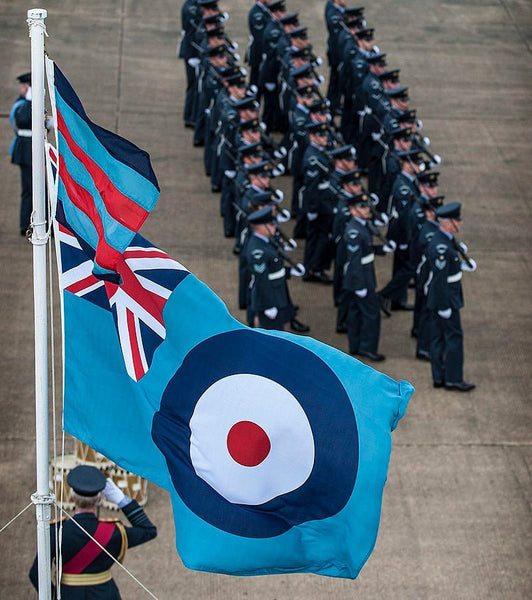 The Royal Air Force Ensign is the official flag which is used to represent the Royal Air Force. The ensign has a field of air force blue with the United Kingdom's flag in the canton and the Royal Air Force's roundel in the middle of the fly.